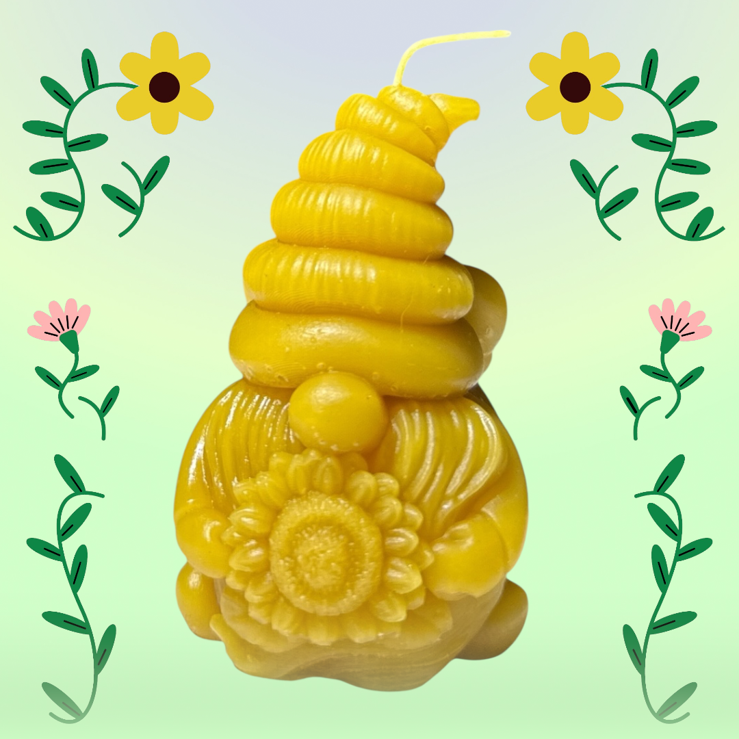 This little 3.24 in Natural Beeswax Gnome with Sunflower Candle is ready help you share spring with any guest you may have! So cute you may have trouble burning him as a candle, but if you do, rest easy knowing he is made from all-natural beeswax and will burn smut free and is non allergic and free from all other chemicals or dyes. The natural beeswax also gives off a wonderful scent when burnt, if you can bring yourself to burn it.